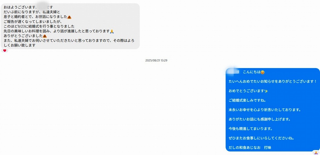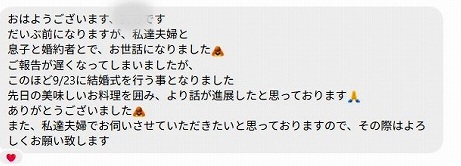 そのメッセージは、以前当店で、息子様のご結婚前のお顔合わせをされた方からのメッセージでした。