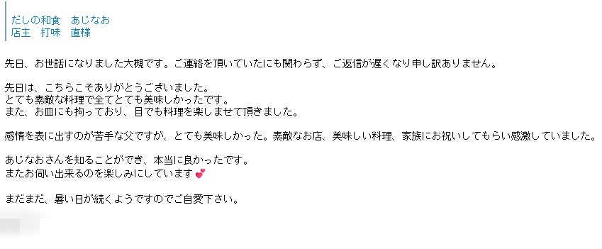 感情を表に出すのが苦手な父が「とてもおいしかった」「素敵なお店」「美味しい料理」家族にお祝いしてもらい感激していました。