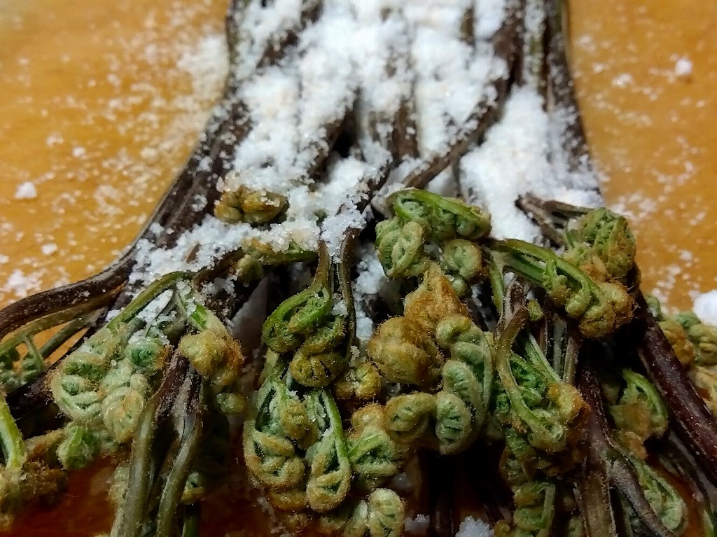(わらびを塩で板摺りして、灰をまぶした上から熱湯をかけアク抜きをする方法です)