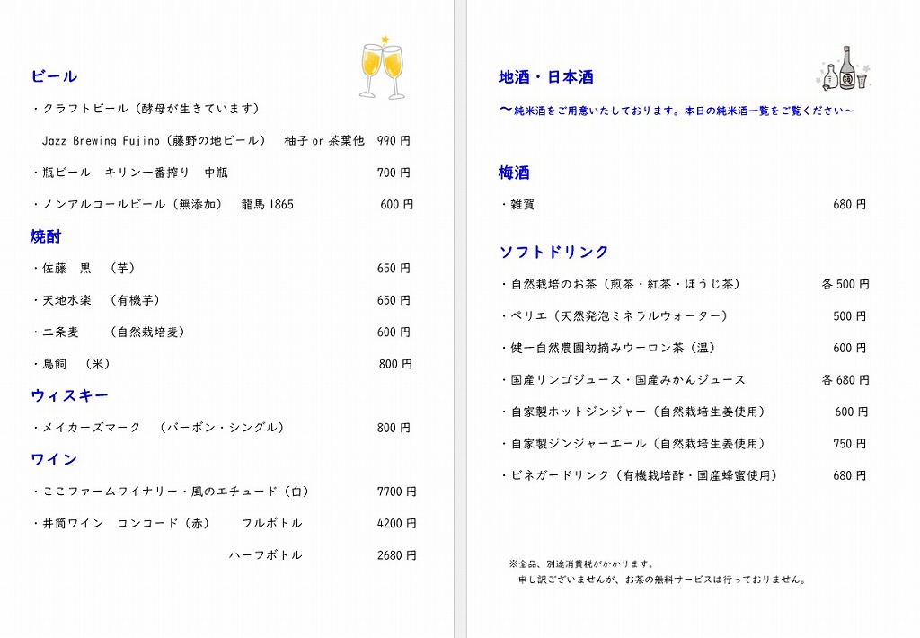 日本全国純米地酒・本格焼酎・オリジナルソフトドリンク等、以下のメニューにないものもご用意いたしております。