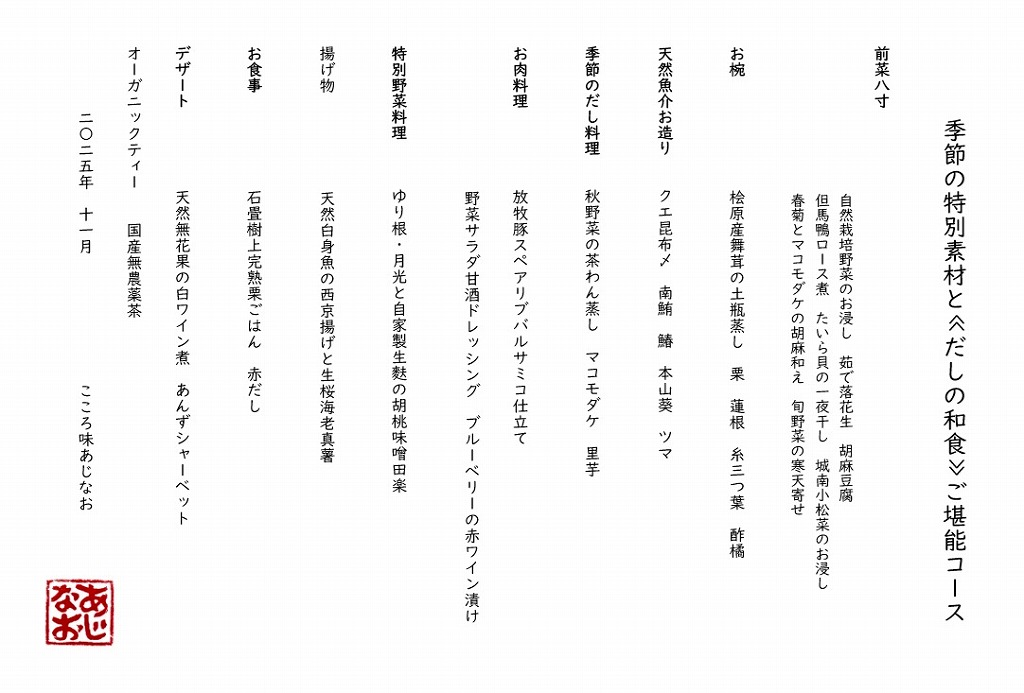 (基本ご予約制です。内容・写真は2025年11月のコース内容例です。時期、仕入れ等により変化いたします。)