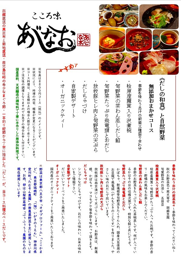 A・≪だしの和食≫と自然野菜・天然魚介と放牧豚入りおまかせコース・・8000円