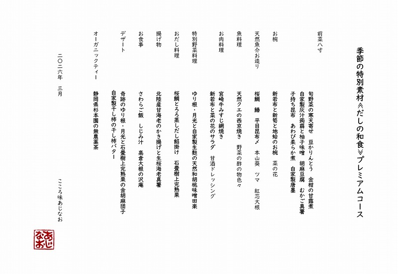 (基本ご予約制です。内容・写真は2026年3月のコース内容例です。時期、仕入れ等により変化いたします。)