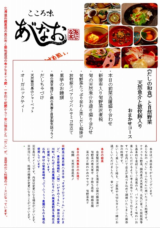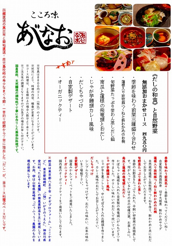 A・≪だしの和食≫と自然野菜・天然魚介と放牧豚入りおまかせコース