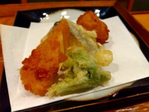 (すり身を使わず鮮魚だけで作った真薯と西京漬けの天ぷら、自家製の生麩フライです。