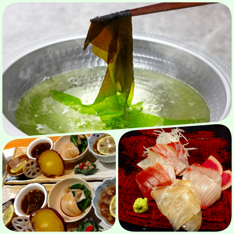 (生わかめ「だししゃぶしゃぶ」+お刺身3種盛り合わせ+前菜5種盛り合わせ+お食事+デザート+オーガニックティー)